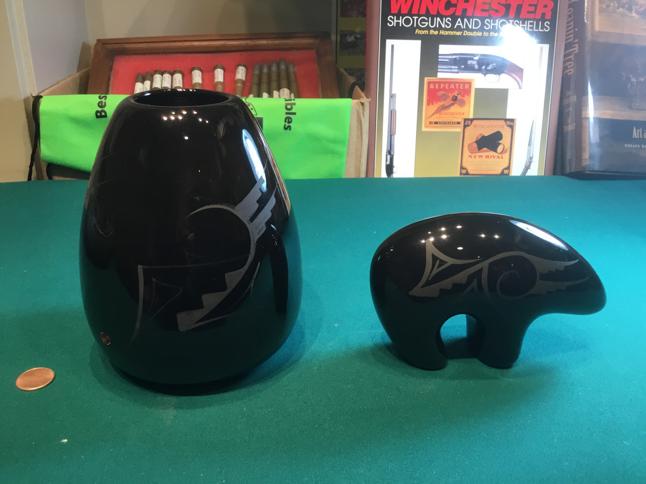 Alaskan style pottery, Vase and Bear very glossy black, can be sold separately, $59 for the vase and $49 for the bear. Note $99 for both! Look at photos please. Will ship anywhere, call or e-mail for a shipping quote.