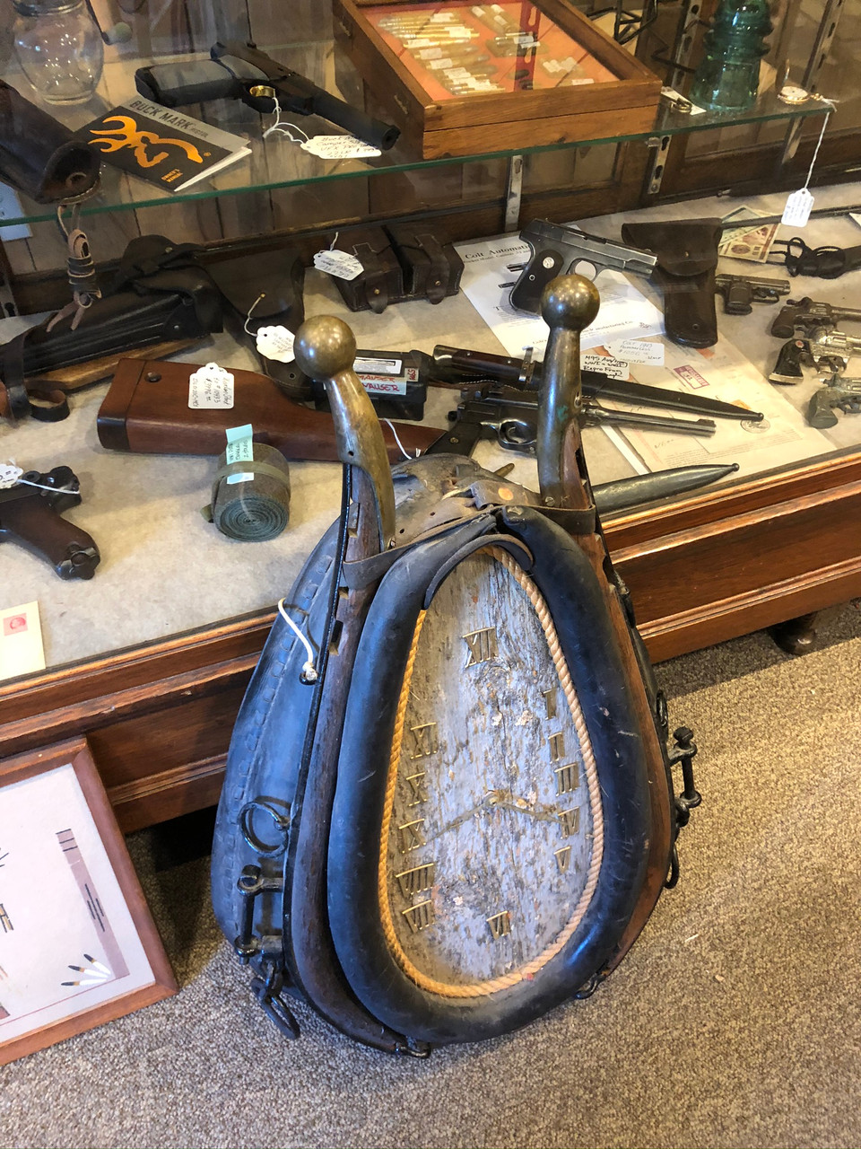 Antique horse collar clock. Western collectible with Leather and Brass. Great vintage Western Decor. A must buy for aficionados of Vintage Western Decor and Antique Collectibles. This is an older piece, Age unknown. One leather strap is stamp "195". It is mostly made of leather with some metal and wood and two big brass pieces. Really neat looking wall hanger or decoration for somebody's western theme room! I am not an expert about this type of item so please look carefully at the photos to see exactly what you will receive. This piece is a little dusty from hanging up on a wall for years. I am selling it “as-is”. I will let the new owner decide how to polish up this beauty. ; )