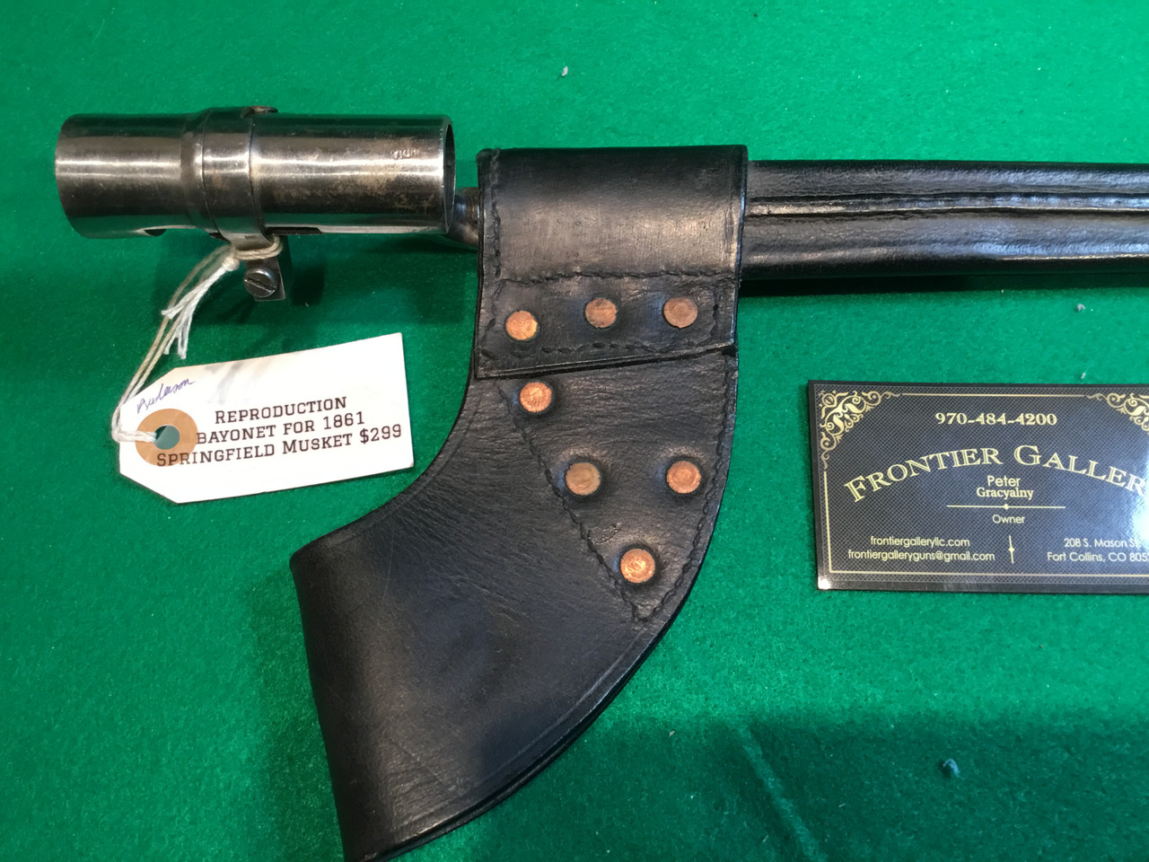 Loading... Please wait...Bayonet for 1861 Springfield with nice leather scabbard. Scabbard has nice "Civil War Era" stamp in the leather, also handsome copper rivets and stitching. was made in India. High quality reproduction. See photos. Please call or e-mail with any questions.