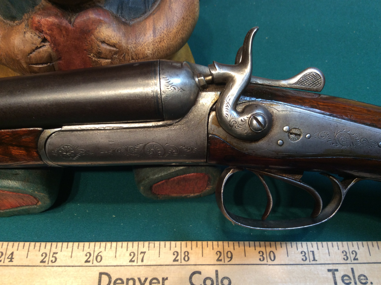Loading... Please wait...Belgium SxS 12ga with hammers. May have been re barreled, note the different color of the barrels to rest of shotgun. Note the lead fill, to tighten action. I believe the hammer receiver assembly is older, then the barrels. The shotgun was used in the 50s and sadly was varnish as well. Note unique fore arm take down button or plunger. Old style engraving. The sling mounts may have been added too. A nice old side by side for that cabin...that you have or going to have! No name or model that I can find, just the proof marks seen it the photos. Thanks for looking SOLD 02/02/21
