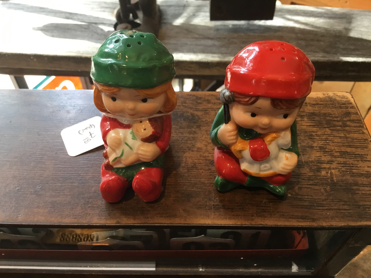 Loading... Please wait...A pair, boy and girl Santa helpers elves making toys for Christmas salt and pepper shakers, boy that was a mouthful. Something that would be cool for children during that season or just nice to put on a little shelf. Please look at the photos, thanks