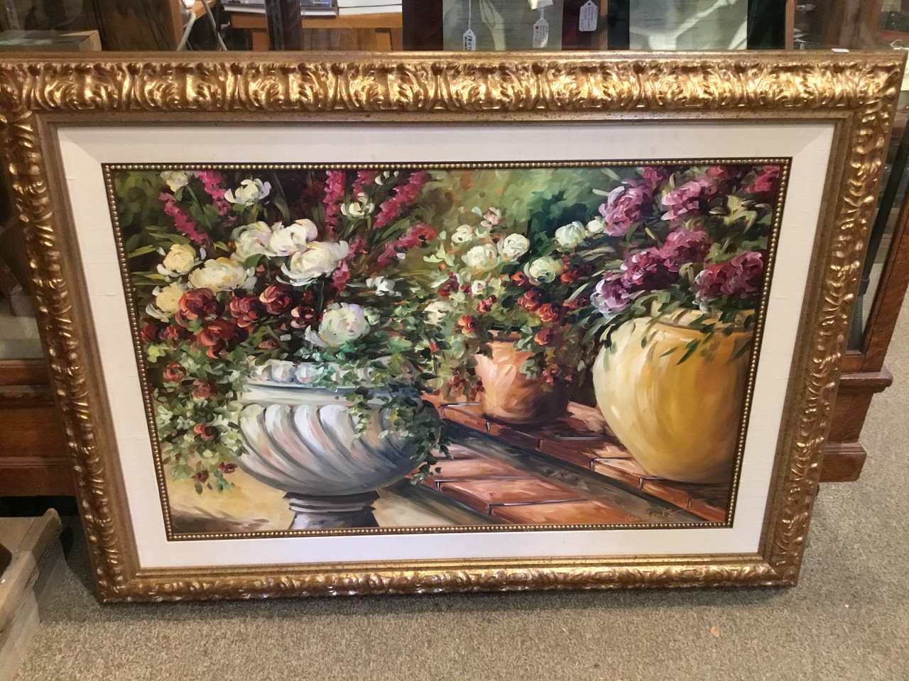 Framed oil & canvas painting with large pots with flowers by artist Peggy Corthouts. Large heavy ornate gold frame SOLD