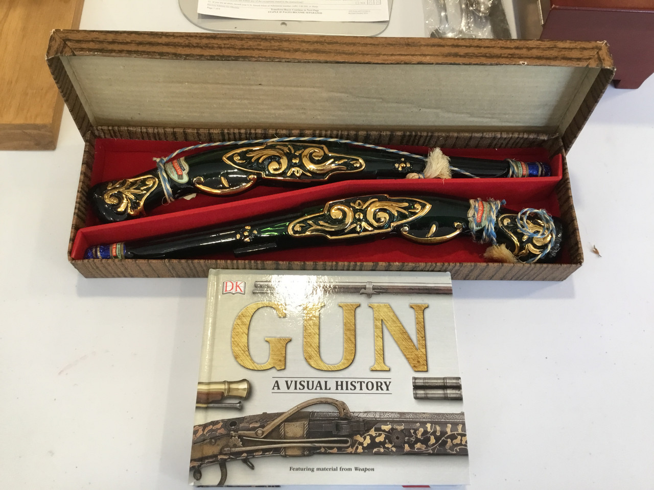 Loading... Please wait...Made in Italy. Very cool vintage era piece of a Matching pair of Dueling pistols, design in gorgeous green glass to be used as a wine decanter , Barsottini Vino Rosso, Red Wine Product of Italy bottled by casa vinicola rocaccio di bartosini fedeli cortabilo Firenze, gold gilt decorated, incredible relief. cork stopper, with hanging raffia (blue & white color) thread. label marks, with aged excellent condition. Note some of wine has evaporated. A decorative bar ware accessory. Second label noted Imported by Banfi Products Corp. Farmington New York with permit numbers " N 2-1-305 " 17" x 3". With original BOX! Box measures 17 1/2" x 5 1/2" x 1 3/4". Because its age and that it is fragile this is sold " AS IS " plus you must be over 21 to purchase, but please do not drink it... ; )