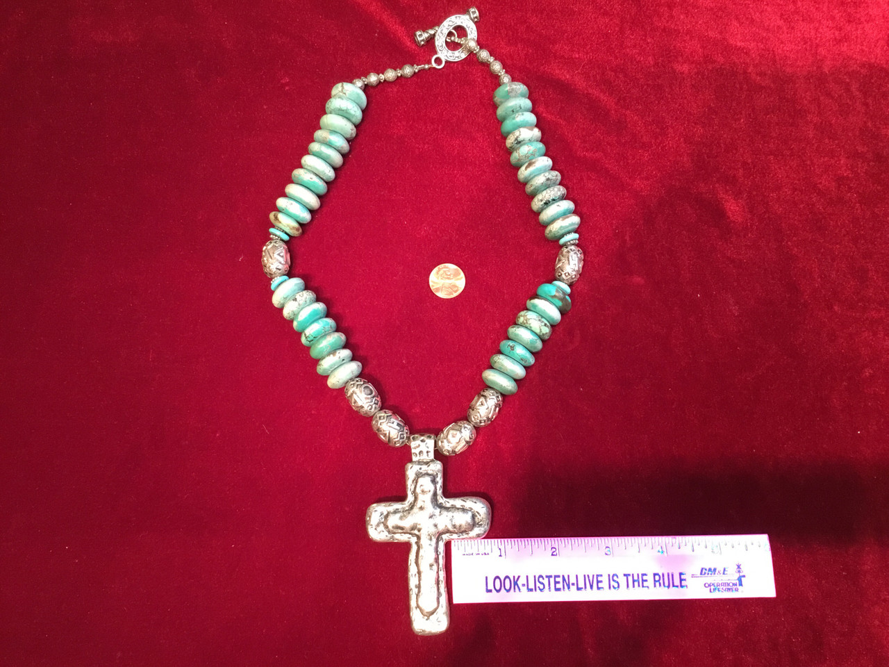 Cross on a necklace with faux silver and turquoise.This is a big and heavy piece. It show some wear. It is a used piece. Please look at photos. Thanks!