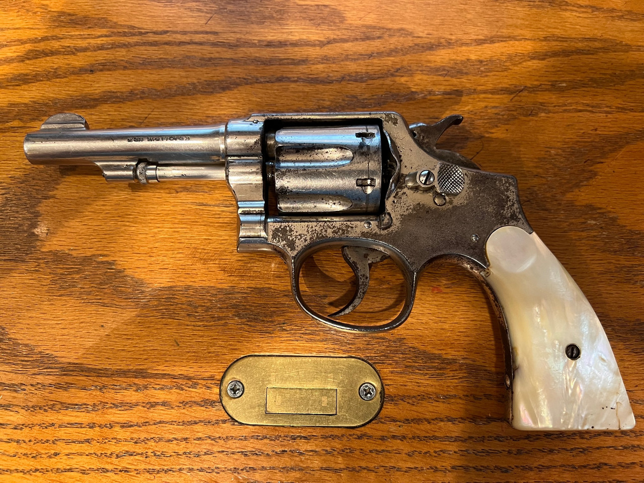 Loading... Please wait...Smith & Wesson Nickel plated Revolver .32 W.C.F. CTG 6 shot wheel gun. in GOOD TO FAIR condition, sold as is. Nice old Pearl White grips. may need some MINOR gunsmithing for swing out of cylinder, now especially if you want to shoot it. Has a cool look. Was used by a businessman in the 20s and 30s to take the deposit to the local bank. manufactured on or around 1914 to 1922. You are responsible for ALL laws on this firearm in your city, county and State. Sales to Calf. are $25 extra. All Old/Used Guns should be checked out by a Gunsmith before you fire them!!