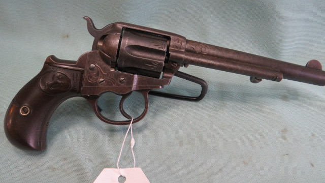 Loading... Please wait...SOLD* Colt Lightning. .38 Colt. Manufactured in 1903. This gun's original bluing has turned a grayish-brown patine. The grips are well worn. With some of the original checking up at the top. The engraving is not Factory. But with nice swirl on the cylinder frame and Barrel. Call with questions and to order. 303-733-4200