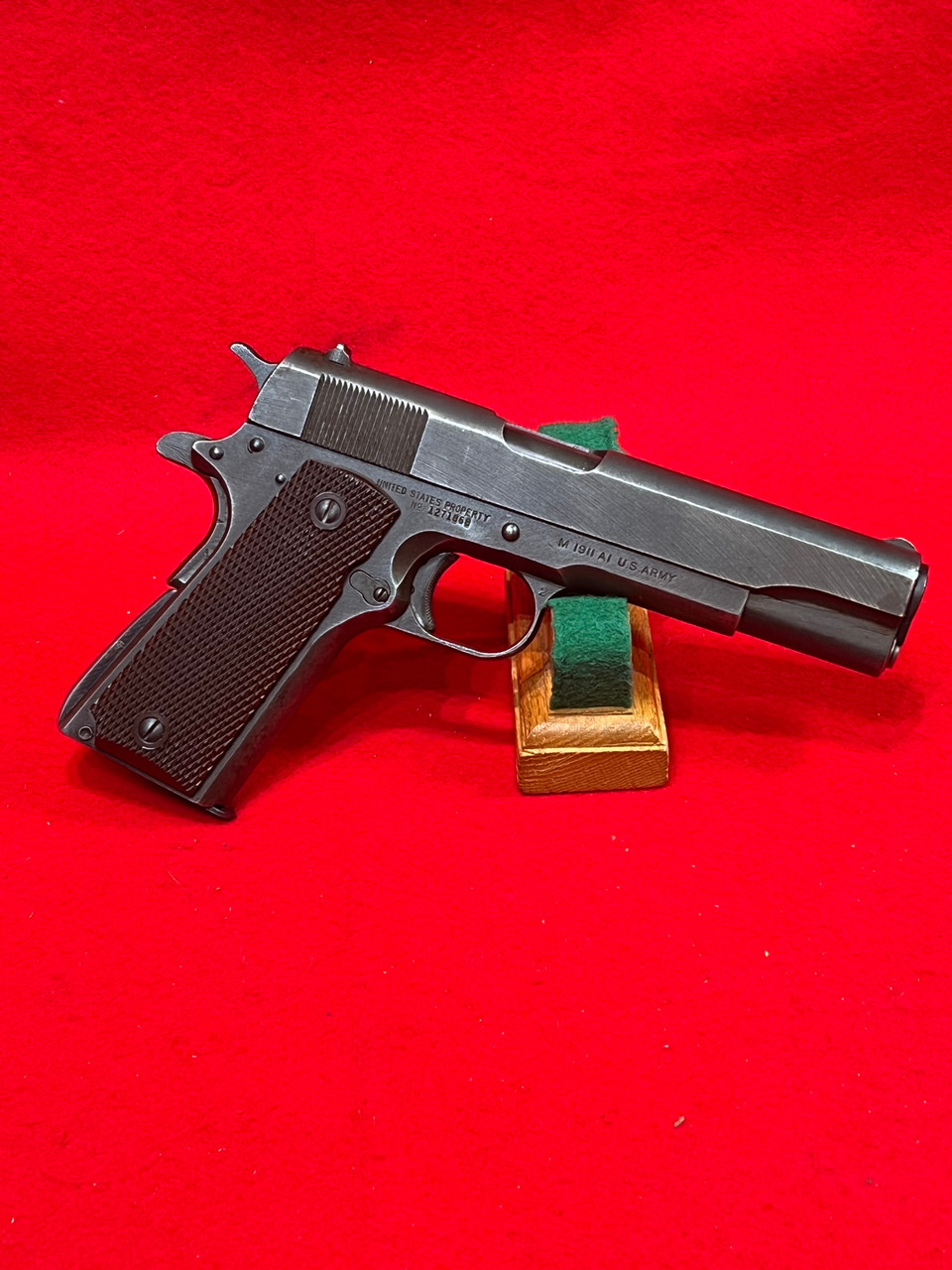 For sale here is a very unique 1911! Judging by the serial number we believe this 1911A1 may have seen some action in WWII. At one point this was a pistol comprising entirley of Ithica parts. At some point though it may have seen a little "too much" action, and the slide was replaced with a Remington brand slide, making this a "Franken" 1911A1. Bore it in good shape (see pictures). Grips are in great shape! Metal parts are in decent shape. On thre left side of the frame there are stamps reading "P" and "FKA". On the left side of the trigger guard there is a stamp we can't make out. On the right side of the frame there are stamps reading "UNITED STATES PROPERTY No 1271868" and "M 1911 A1 U.S.ARMY" On the right side of the trigger guard there is a stamp reading "2". Come with two 7 round magazines, one of which is sealed in brown paper.