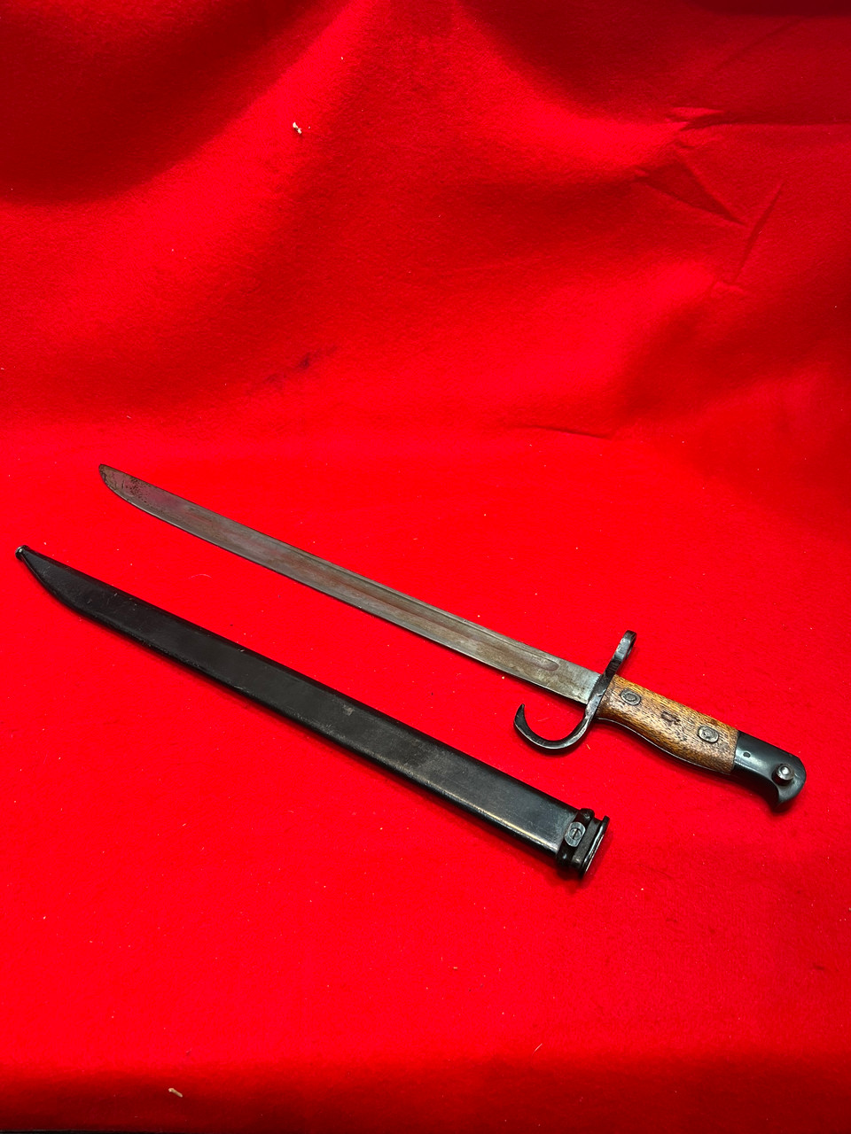 For sale here is an interesting bayonet. This appears to be a Japanese Type 30 style "training" bayonet. Unlike othere Japanese bayonets there appear to be no factory marks and the blade is blunt. The blade length is about 15.5in and has moderate amounts of discoloration. Blade is bent just above the qullion. The handle is in decent shape overall. Comes with a metal sheath that is black in color.