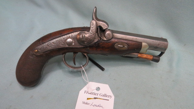London Pocket Pistol. .50Cal. Barrel condition is dark with even pitting. The checkering on the grip is still quite Sharp. This is an Antique so no FFL required.