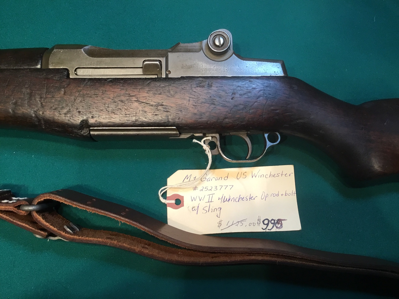 Loading... Please wait...ON HOLD M1 Garand by Winchester, USED WWII, 30.06 cal., she is a tired old girl. has been rebuild. Has a lot of Winchester parts! Throat 5.5 muzzle 3.0, she is tried but I have shot it a fair amount. I like the serial # 2528777...Lucky? Sling is a used repro, but is a nice one and come with the rifle. Very dark walnut stock that is original to the gun, I believe. The color is matching (fore arm etc looks like it was not replaced) thru out. This M1 has a very nice old WWII look. On sale now from $1125.00 to $995.00