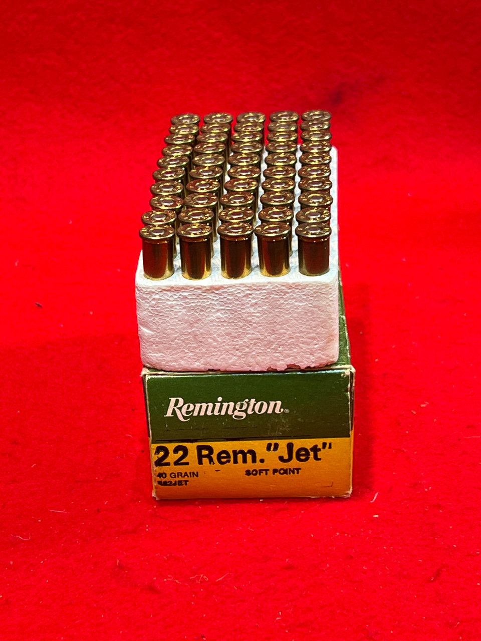 Loading... Please wait...For auction here is some 22 Rem Jet. This centerfire round was designed in the early 60s to be used in rifles and revolvers for varmint hunting. These rounds are Remington brand, andhave 40 grain soft point bullets.