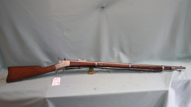 Loading... Please wait...Remington Rolling Block New York Militia Pattern. 50-70, The bore is bright with very good lands/grooves. the wood has typical use marks. this gun has a half cock safety. the receiver and barrel Finish is in great condition. no FFL required.