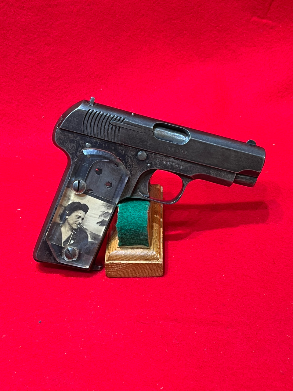 This particular Ruby pistol is rather unique. The original grips have been replaced with clear-plastic grips. Inside of each grip is a picture of a woman. The picture on the right side of the grip shows a clothed woman, and the picture on the left depicts a nude woman. These are often reffered to as "Sweet Heart Grips" and while Americans were the most notorious for making these, soldiers from many nations and fronts would create these to keep their loved ones close, even in the field of battle. The grips are in decent shape. The plastic grips lead us to believe this is a WWII era pistol. The metal parts have some dings, scratches, and wear from use. All matching serial numbers. WE DO NOT RECCOMEND FIRING THIS PISTOL. This should be considered a "collectable". DO NOT FIRE THIS PISTOL UNTIL A GUNSMITH HAS EXAMINED IT. Actual weight 1lb 13oz